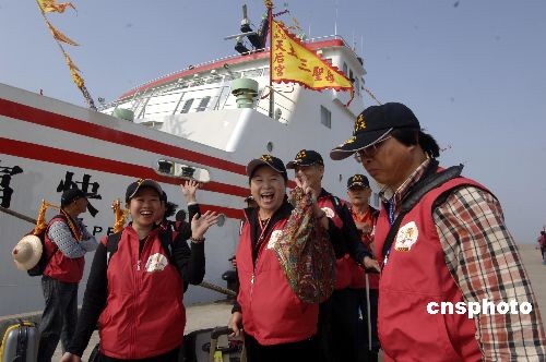 2月13日,搭載著428名臺灣媽祖信眾的“合富輪”緩緩抵達“媽祖故鄉(xiāng)”湄洲島的3000噸級對臺客運碼頭。這是2008年底海峽兩岸簽訂“兩岸海運協(xié)議”后的第一個兩岸海上客運直航活動,也是湄洲島口岸繼與金門、馬祖實現(xiàn)海上客運通航后的又一突破。圖為臺灣媽祖信眾抵達后非常興奮。 中新社發(fā) 王東明 攝