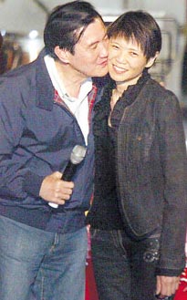 臺中市太陽餅業(yè)者特別提供一款心型太陽餅,由馬英九獻(xiàn)給周美青表達(dá)愛意,馬英九并在眾人起哄下,擁著周美青輕輕吻了她臉頰一下,夫妻恩愛之情,贏得臺下觀眾如雷掌聲。(高大林)