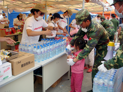 汶川地震期間,頂新集團送去食物、飲用水等救災(zāi)物資,和災(zāi)區(qū)人民共度難關(guān)。(頂新集團提供)
