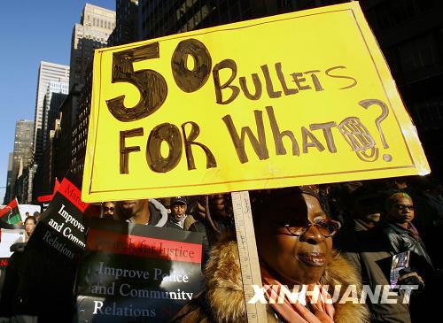 這是2006年12月16日,一名女子手舉抗議標(biāo)語(yǔ)參加在紐約第五大道舉行的抗議游行,標(biāo)語(yǔ)牌上寫道:為什么要開50槍?當(dāng)日,數(shù)千名美國(guó)民眾聚集在紐約第五大道舉行示威活動(dòng),抗議非洲裔美國(guó)人肖恩·貝爾上月遭警察無端射殺。在美國(guó),警察濫施暴力,侵犯公民權(quán)利。 新華社發(fā)