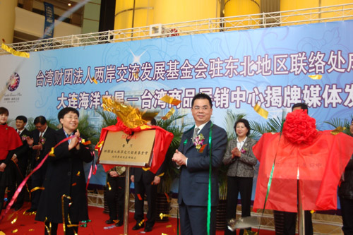 3月22日,臺灣財團法人兩岸交流發(fā)展基金會駐東北聯(lián)絡(luò)處在大連經(jīng)濟技術(shù)開發(fā)區(qū)南部海濱的大連海洋之星正式掛牌,大連海洋之星臺灣商品展銷中心也同時揭牌。據(jù)悉,大連海洋之星項目全部建成后,將成為臺灣商品走向東北地區(qū)的集散地與銷售平臺,逐步形成臺灣產(chǎn)品在大陸銷售“南有廈門,北有大連”的格局。圖為揭牌儀式現(xiàn)場。(攝影 朱潤博 魏勤英)