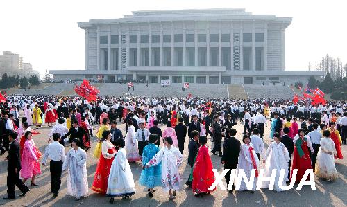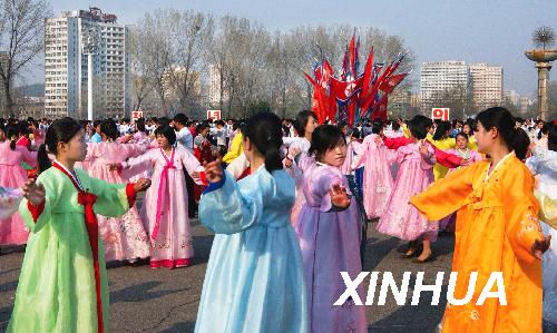 4月9日,朝鮮首都平壤舉行集體舞會,慶祝朝鮮最高領(lǐng)導(dǎo)人金正日再次當(dāng)選朝鮮國防委員會委員長。朝鮮第12屆最高人民會議第一次會議當(dāng)日在平壤舉行,再次推舉朝鮮最高領(lǐng)導(dǎo)人金正日為國防委員會委員長。新華社/朝中社