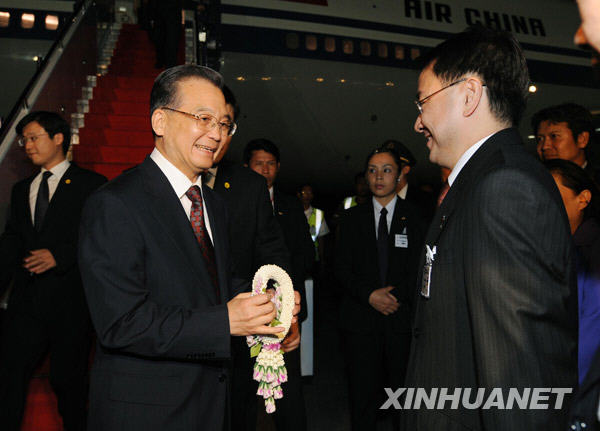 4月10日,國務(wù)院總理溫家寶乘專機(jī)抵達(dá)泰國,出席即將在帕塔亞舉行的第十二次中國與東盟領(lǐng)導(dǎo)人會議、第十二次東盟與中日韓領(lǐng)導(dǎo)人會議、第四屆東亞峰會和中日韓領(lǐng)導(dǎo)人早餐會。這是溫家寶在機(jī)場受到泰方官員和中國使館人員熱烈歡迎。新華社記者 饒愛民 攝