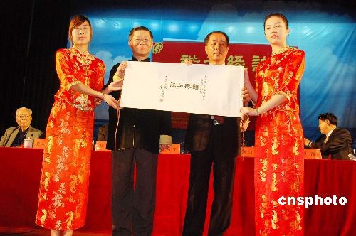 4月13日,第二屆海峽兩岸和諧文化節(jié)在福建泉州華光攝影學(xué)院開幕,活動通過兩岸藝術(shù)文獻(xiàn)的匯集展覽和兩岸文化藝術(shù)界人士的雅集聯(lián)誼,共同抒寫兩岸和諧文化交流的新篇章。圖為臺灣兩岸和諧文化交流協(xié)進(jìn)會會長陸炳文向華光攝影學(xué)院贈送了中國國民黨主席吳伯雄題寫的“諸事和諧”賀詞。 中新社發(fā) 黃瑤瑛 攝
