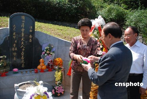 中新社桂林四月二十日電 (記者 周利朔 歐惠蘭)蔣經國與章亞若之子、中國國民黨副主席蔣孝嚴四月二十日來到桂林市郊區(qū)馬鞍山西側鳳凰嶺下祭拜生母章亞若。