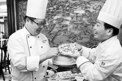 圖為臺(tái)灣涵碧樓大飯店總廚劉宏峰(左)向上海綠波廊酒樓技術(shù)總監(jiān)陸亞明介紹臺(tái)灣名點(diǎn)“紅豆松糕”。葛鳳章攝