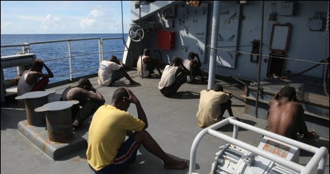 被抓獲的海盜在軍艦上受看押。