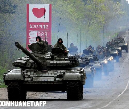 5月5日,一隊(duì)格魯吉亞坦克行駛在首都第比利斯附近。格內(nèi)務(wù)部5日宣布,格強(qiáng)力部門當(dāng)天聯(lián)合挫敗一起由格高級軍官策劃的軍事叛亂,該叛亂旨在破壞即將于6日舉行的北約軍事演習(xí),并推翻由總統(tǒng)薩卡什維利領(lǐng)導(dǎo)的現(xiàn)政權(quán)。 新華社/法新