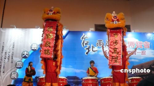 鑼鼓喧天的迎賓獅舞中,臺北兩岸觀光博覽會于臺北世貿(mào)一館開幕。來自大陸十一個省市的旅游業(yè)者在館內(nèi)積極向臺灣民眾推介大陸旅游資源。