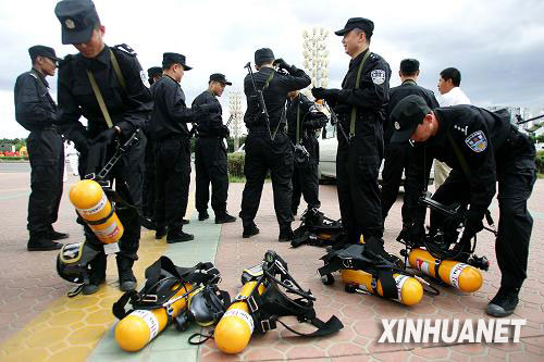 6月9日,特警在裝備防毒設(shè)備。新華社發(fā)(鄭煥松攝)