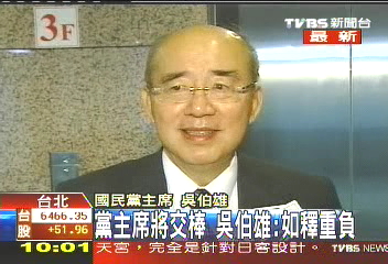 馬英九前晚與吳伯雄會(huì)面,兩人會(huì)談決定今天下午于國(guó)民黨中常會(huì)后共同召開(kāi)記者會(huì)。對(duì)于兩人前晚的會(huì)談,吳伯雄說(shuō),“他告訴我他的決定,我本來(lái)就是絕對(duì)配合”;去年5月談到黨主席由馬英九來(lái)兼任的時(shí)候,“我就是無(wú)所求、無(wú)所爭(zhēng),只要對(duì)大局有利,我都可以配合,我的心意沒(méi)有變過(guò)”。