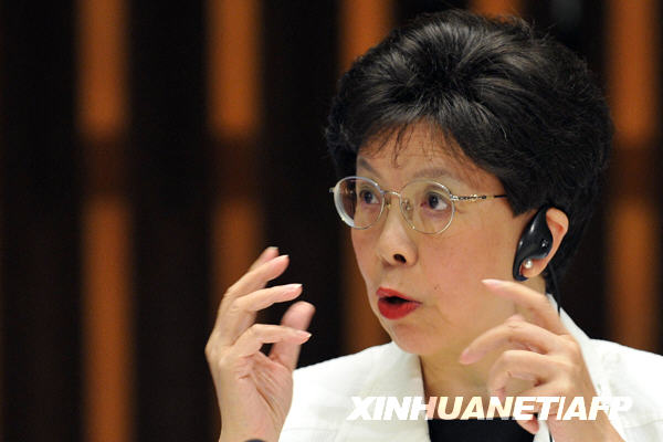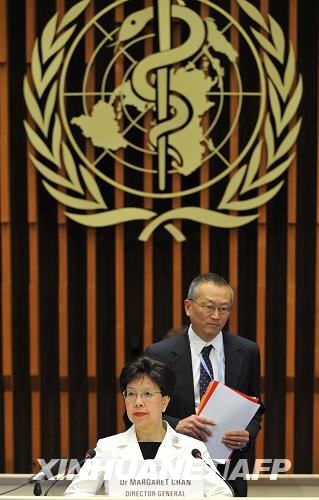 6月11日,世界衛(wèi)生組織總干事陳馮富珍在新聞發(fā)布會上。當(dāng)日,世界衛(wèi)生組織總干事陳馮富珍正式宣布把甲型H1N1流感警戒級別升至6級。新華社/法新