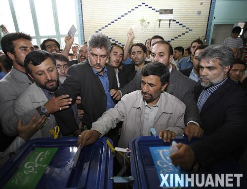 6月12日,伊朗現(xiàn)任總統(tǒng)艾哈邁迪-內(nèi)賈德(前中)在德黑蘭參加總統(tǒng)選舉投票。伊朗第10屆總統(tǒng)選舉投票于當?shù)貢r間12日上午8時(北京時間11時30分)開始,新總統(tǒng)將在現(xiàn)任總統(tǒng)艾哈邁迪-內(nèi)賈德、前總理穆薩維、前議長卡魯比和前伊斯蘭革命衛(wèi)隊總司令雷扎伊4名候選人中產(chǎn)生。新華社發(fā)