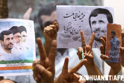 2009年6月13日 支持者慶祝艾哈邁迪-內(nèi)賈德贏得伊朗總統(tǒng)選舉 6月13日,在伊朗宗教圣城庫姆街頭,現(xiàn)任總統(tǒng)艾哈邁迪-內(nèi)賈德的支持者們舉著他的畫像,做出勝利的手勢。根據(jù)伊朗選舉委員會當日凌晨公布的數(shù)據(jù),在已統(tǒng)計的94%的選票中,艾哈邁迪-內(nèi)賈德贏得64.31%的選票,從而贏得伊朗總統(tǒng)選舉。 新華社/法新