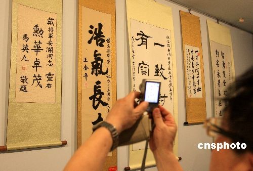 7月4日,“紀(jì)念戴安瀾將軍誕辰一百零五周年——海峽兩岸書畫交流邀請展”在上海緊張布展,一幅臺灣地區(qū)領(lǐng)導(dǎo)人馬英九專程送展的親筆手書“勛華卓茂”引人注目。該展覽將于5日開幕,展出書畫作品三百五十幅,其中臺灣地區(qū)作品八十幅,當(dāng)中還有不少兩岸知名人士“重量級”展品。 中新社發(fā) 潘索菲 攝