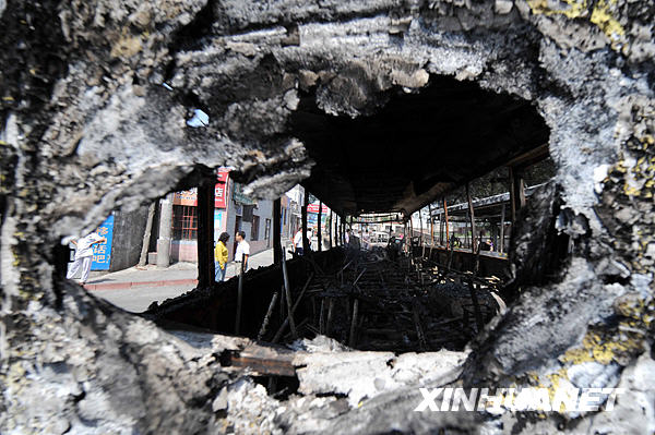 7月6日,烏魯木齊市一家被燒毀的超市一片狼藉。新華社記者 沙達(dá)提攝