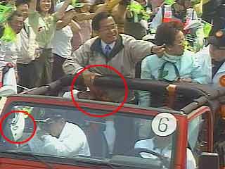 “第一時間的情況就是這樣,并不覺得是被子彈打到。但是后來愈來愈痛,好像針在刺一樣,但一直不敢看我的傷口,因為車隊不停的前進,我更忙著向支持者揮手,同時嘴里也不停的向大家喊:‘拜托、拜托!一號、一號!’后來痛到實在忍不下去,我叫隨車警衛(wèi)官張春波:‘波sir,你幫我看一看到底是怎么回事?’波sir說:‘衣服破了一個洞!’我告訴他,被鞭炮打到,沒關(guān)系,幫我拿面速力達姆擦一下就好了!”
