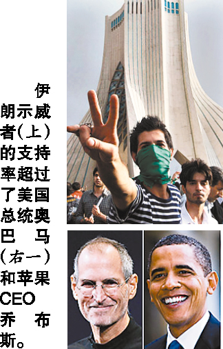 截至昨日,《時(shí)代》網(wǎng)站的公眾投票情況顯示,伊朗抗議者以91分的高支持度和72822張支持票暫列第一,并且將第二名美國總統(tǒng)奧巴馬遠(yuǎn)遠(yuǎn)拋在后面。后者的票數(shù)目前僅為24792,分?jǐn)?shù)為55。以下為支持率排在前五名的候選人物。