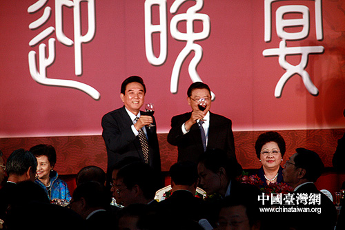 21日晚間,;鶗O宴款待參加兩會領導人第四次會談的海協(xié)會代表團全體成員。圖為海協(xié)會會長陳云林(右)與;鶗麻L江丙坤(中國臺灣網 李徽 攝)