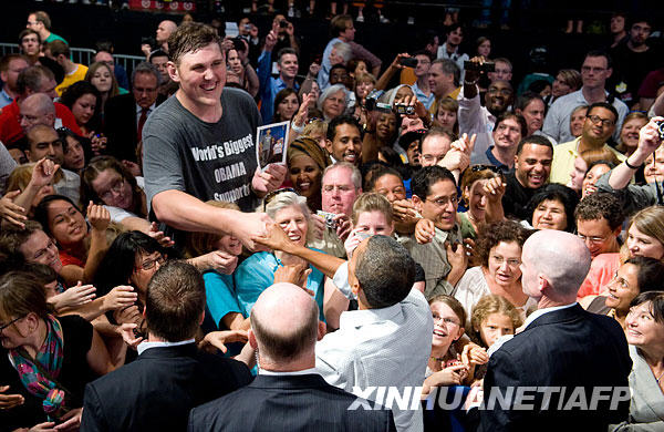 9月12日,在美國明尼蘇達(dá)州的明尼阿波利斯,美國總統(tǒng)奧巴馬(下,中)發(fā)表關(guān)于醫(yī)療改革方案的演講后與一名身高達(dá)2.3米的支持者握手。當(dāng)天,奧巴馬向過萬名現(xiàn)場聽眾闡述醫(yī)療改革方案。他還指責(zé)反對醫(yī)改者利用“恐嚇手法”阻撓改革。新華社/法新