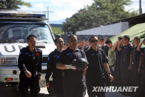1月16日,在海地首都太子港,中國(guó)駐海地維和警察防暴隊(duì)的官兵運(yùn)送被埋戰(zhàn)友遺體回營(yíng)地。新華社記者邢廣利攝