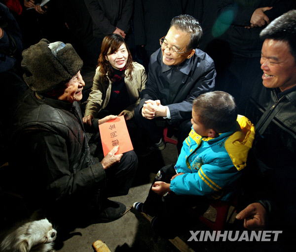 在村民黃忠英家,總理和大家圍著一盆炭火,共商抗旱大計。村子里有多少人?旱情怎么樣?有多長時間沒有下雨?附近有沒有水庫……溫總理向村支書黃峰詳細詢問有關(guān)情況后說,這個地方已經(jīng)連續(xù)干旱缺水,現(xiàn)在氣象還很難預(yù)料,也許干旱還將持續(xù)下去,我們要做好迎接更大困難的準備。當前旱區(qū)農(nóng)村工作要以抗旱為中心;首先要保人畜飲水,同時要搞好春耕備耕;黨員干部要到第一線,帶領(lǐng)和組織群眾抗旱,統(tǒng)籌調(diào)度水資源;要保證節(jié)日期間群眾用水,讓群眾過一個歡樂祥和的春節(jié)。他強調(diào),從長遠看,根本解決水的問題,要統(tǒng)籌規(guī)劃水庫、塘壩、水柜等水利基礎(chǔ)設(shè)施建設(shè),財政要給予支持,做到來水時能存得住,干旱時能用得上,切實把這件關(guān)系群眾切身利益的問題解決好。