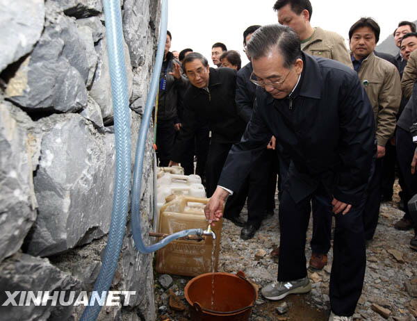 在村民黃輝家,溫家寶和他75歲的母親聊起家常?偫碚埨先朔判,政府一定會讓大家有水喝、有水用。他對當?shù)刎撠?zé)人說,春節(jié)到了,春耕也快到了,旱情形勢不容樂觀,抗旱工作不可松懈。要把水利設(shè)施建設(shè)擺在農(nóng)村建設(shè)的第一位,不僅要保證人畜飲水,還要滿足農(nóng)業(yè)生產(chǎn)需要。要大力興建水庫,修建引水工程、雨水集流工程,包括家庭水窖、水柜、水管等,把水送到家家戶戶,確保群眾用上干凈、衛(wèi)生、安全的水,同時也要注意節(jié)約用水。