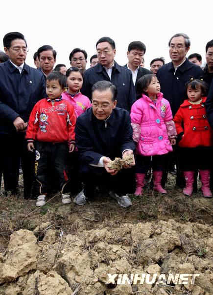 2月12日至13日,中共中央政治局常委、國務(wù)院總理溫家寶來到廣西河池市東蘭縣、巴馬瑤族自治縣,看望慰問受災(zāi)群眾,指導(dǎo)抗旱救災(zāi)工作。這是2月12日,溫家寶在河池市東蘭縣三石鎮(zhèn)巴造村的田地里查看災(zāi)情。新華社記者 姚大偉 攝