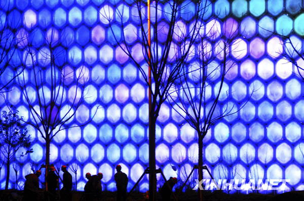 3月11日,工人在進行夜景燈光調(diào)試的信息通信館前施工。 新華社發(fā)