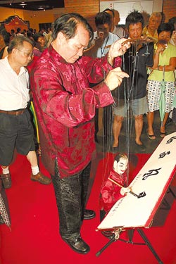 來自福建連城的木偶書法大師李明卿,在現(xiàn)場表演垂線木偶手寫書法絕技,看得現(xiàn)場民眾嘖嘖稱奇。(圖片來源:臺(tái)灣《中國時(shí)報(bào)》)