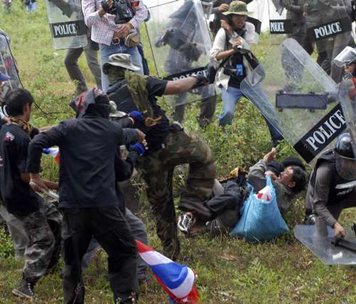 由于當(dāng)?shù)鼐用癫粷M黃衫軍在當(dāng)?shù)厥就,村民?dān)心會(huì)影響國家聲譽(yù)和柬埔寨的關(guān)系,因此村民在通往柏威夏寺的路上搭起路障,防暴警察也全副武裝,防止示威者通過。電視片段所見,黃衫軍多次揮動(dòng)長棒,與防暴警察和試圖阻止他們進(jìn)入柏威夏寺一帶的村民發(fā)生沖突(見圖)。省政府官員表示有數(shù)十人在騷亂中受傷,其中二十人要送院治理,一名送院者頸部受到槍擊。事件最后在警方調(diào)解下解決。