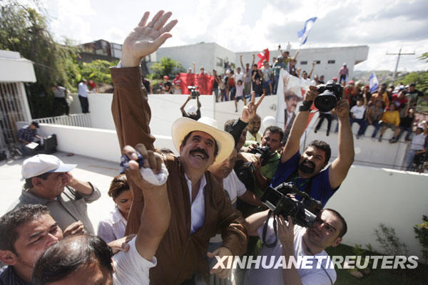 9月21日,在洪都拉斯首都特古西加爾巴的巴西駐洪都拉斯使館,被罷免的洪都拉斯總統(tǒng)塞拉亞(中)向他的支持者揮手。在6月28日政變中遭罷免被驅(qū)逐出境的總統(tǒng)塞拉亞21日通過(guò)當(dāng)?shù)匾患译娨暸_(tái)宣布,他已回到首都特古西加爾巴。巴西外交部隨后證實(shí),塞拉亞目前在巴西駐洪都拉斯使館。新華社/路透