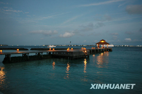 這是9月5日,在馬爾代夫旅游島科倫巴,棧橋上的燈光在暮色中亮起。新華社記者劉詠秋攝