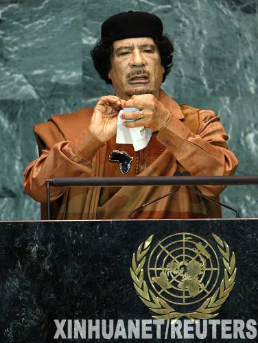 9月23日,利比亞領(lǐng)導(dǎo)人穆阿邁爾·卡扎菲在聯(lián)合國大會(huì)一般性辯論上發(fā)言時(shí),佯裝要撕毀《聯(lián)合國憲章》?ㄔ23日在第64屆聯(lián)大一般性辯論中發(fā)言說,必須在國際政治中實(shí)行民主,對(duì)聯(lián)合國及安理會(huì)實(shí)行改革,真正實(shí)現(xiàn)各國在聯(lián)合國的平等地位。這是卡扎菲執(zhí)政40年來首次來到紐約聯(lián)合國總部并在聯(lián)大一般性辯論中發(fā)言。新華社/路透