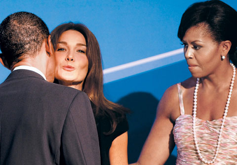 據(jù)武漢晚報報道,3張美國總統(tǒng)奧巴馬夫婦在9月24日晚二十國集團(tuán)(G20)領(lǐng)導(dǎo)人金融峰會晚宴上的雷人照片成為歐美媒體爆炒的焦點(diǎn)——一張照片顯示,當(dāng)奧巴馬與法國第一夫人布呂尼擁吻時,他身旁的夫人米歇爾滿臉不悅,仿佛打翻了醋壇子;另一張照片顯示,當(dāng)一貫以花心著稱的意大利總理貝盧斯科尼張開雙臂試圖擁抱奧巴馬夫人米歇爾時,一旁的奧巴馬對他怒目相向,而米歇爾也只冷淡地與他握手了事;第3張雷人照片顯示,當(dāng)奧巴馬夫婦與英國首相布朗夫婦合影時,奧巴馬竟忘情地緊緊握住了布朗夫人薩拉的手!當(dāng)這3張照片曝光后,立即在因特網(wǎng)上瘋狂流傳,儼然激起了一場軒然大波。