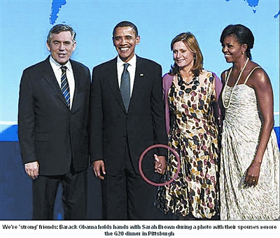 如果說上面2張雷人照片只是“某種巧合”,但第3張雷人照片卻幾乎沒法讓人找到合理解釋了——當(dāng)晚,奧巴馬夫婦與英國首相布朗夫婦相互擁抱接吻行禮之后,站成一排讓記者合影留念,其中奧巴馬和布朗夫人薩拉站立中央,布朗和奧巴馬夫人米歇爾則分別立于兩側(cè)。這本是一張很普通的合影,但讓攝影記者沒有想到的是,在合影時,奧巴馬的左手竟忘情地緊緊握住了布朗夫人薩拉的右手,二人十指相扣,顯得十分親密!
