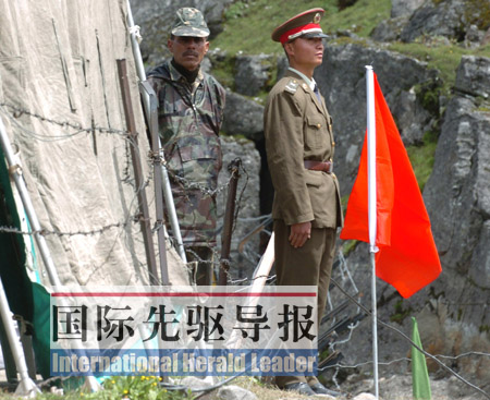中國與印度的邊界問題尚未完全解決。圖為中國邊防軍人(右)與印度邊防軍人隔著中印邊界的鐵絲網(wǎng)值勤。 國際先驅導報本報記者 韓傳號/攝