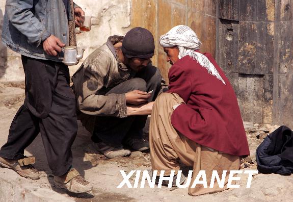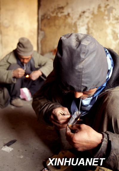 2008年3月10日,兩名男子在阿富汗首都喀布爾一座廢棄的建筑物內(nèi)吸食海洛因。根據(jù)國際毒品控制協(xié)會最新發(fā)布的年度報告顯示,2007年阿富汗鴉片種植量同比增長了17%,年產(chǎn)量達(dá)到8200噸,占全世界鴉片產(chǎn)量的93%。目前,阿富汗仍是世界最大的鴉片和海洛因生產(chǎn)國。新華社記者扎比攝