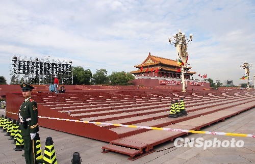 為迎接建國(guó)60周年大慶,在北京天安門(mén)廣場(chǎng)為慶典增設(shè)的臨時(shí)觀禮臺(tái)、大型LED屏幕等設(shè)施,目前正在有條不紊的布置中。 中新社發(fā) 陳曉根 攝