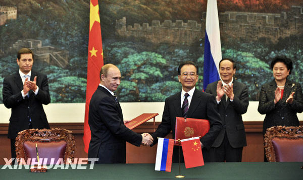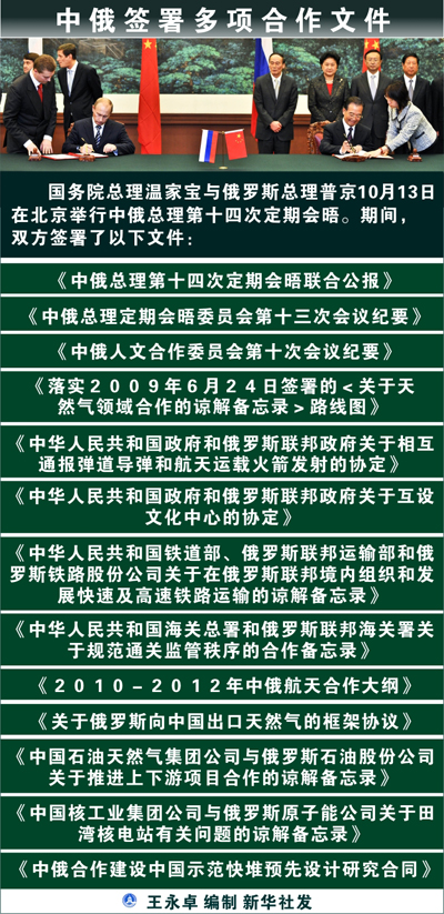 新華網(wǎng)北京10月13日電(記者廖雷、姬少亭)國務(wù)院總理溫家寶與俄羅斯總理普京13日在北京舉行中俄總理第十四次定期會晤。期間,雙方簽署了以下文件: