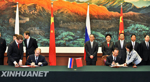 10月13日,國務(wù)院總理溫家寶與俄羅斯總理普京在北京人民大會堂簽署《中俄總理第十四次定期會晤聯(lián)合公報》。新華社記者謝環(huán)馳攝
