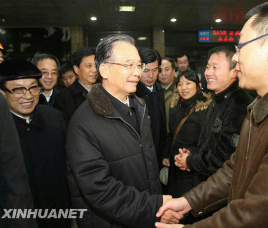 11月12日,中共中央政治局常委、國務(wù)院總理溫家寶趕赴河北暴雪地區(qū)指導(dǎo)工作。圖為抵達石家莊后,溫家寶前往火車站候車室看望旅客。新華社記者劉衛(wèi)兵攝