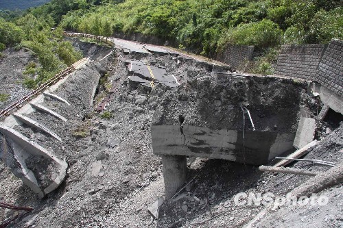 8月11日,中新社記者繼續(xù)涉險(xiǎn)踏訪臺(tái)東縣水患重災(zāi)區(qū),所見所聞、令人震撼。圖為延平鄉(xiāng)松楓大橋與公路聯(lián)結(jié)處,被沖垮、斜墜溪谷,“莫拉克”臺(tái)風(fēng)及洪水爆發(fā)的破壞力令人匪夷所思。 中新社發(fā) 董會(huì)峰 攝