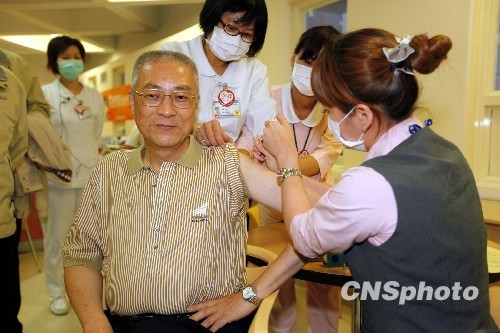 臺灣民眾十二日開始全面接種H1N1疫苗,為鼓勵民眾接種,臺灣行政主管部門負責(zé)人吳敦義帶頭宣導(dǎo),前往位于臺北市的聯(lián)合醫(yī)院仁愛院區(qū)接種疫苗。此外,部分縣市為了吸引民眾接種,安排了不少活動“催針”,如贈送農(nóng)產(chǎn)品、文具、香皂、園游會及搭配健檢等。 中新社發(fā) 曾嘉 攝