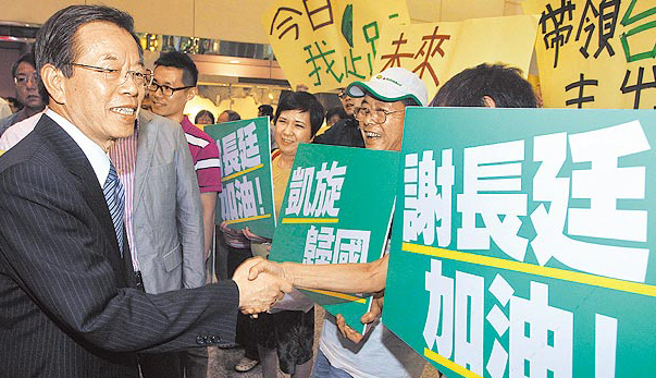 謝長廷(左)昨日返回臺灣,謝系子弟兵高喊口號接機。(圖片來自臺媒)