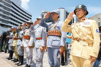 臺(tái)灣新黨青年委員會(huì)昨天至中山堂抗戰(zhàn)勝利紀(jì)念碑前獻(xiàn)花致敬,現(xiàn)場(chǎng)有一群認(rèn)同抗戰(zhàn)歷史的青年著當(dāng)年抗戰(zhàn)軍服前來(lái),希望喚起島內(nèi)民眾與當(dāng)局對(duì)抗戰(zhàn)歷史的重視。圖片來(lái)源:臺(tái)灣《聯(lián)合報(bào)》