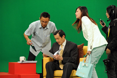 馬英九(左2)10日在臺北壹電視接受專訪。圖為電視臺工作人員在專訪前進行最后確認。圖片來自:臺灣“中央廣播電臺”
