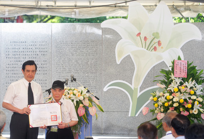 馬英九(左)15日前往臺北市介壽公園“白色恐怖政治受難者紀(jì)念碑”,出席“2013年戒嚴(yán)時(shí)期政治受難者紀(jì)念追思儀式”,頒發(fā)回復(fù)名譽(yù)證書給受難者和家屬。圖片來源:臺灣“中央廣播電臺”