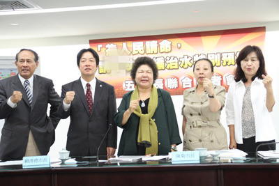屏東縣長曹啟鴻(左起)、臺南市長賴清德、高雄市長陳菊、嘉義縣長張花冠、云林縣長蘇治芬2日在臺南市政府召開記者會,請當局續(xù)編治水特別預算。臺灣“中央社”圖