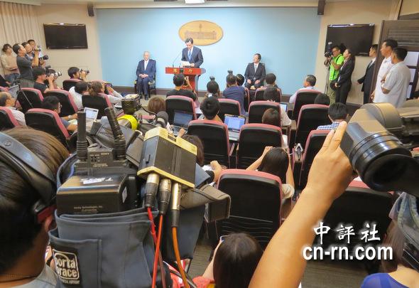 臺(tái)“立法院長(zhǎng)”王金平涉關(guān)說(shuō),馬英九(中)、吳敦義(左)及江宜樺8日下午召開(kāi)記者會(huì),馬英九強(qiáng)調(diào)這是侵犯司法獨(dú)立最嚴(yán)重的一件事,“必須嚴(yán)正面對(duì)”